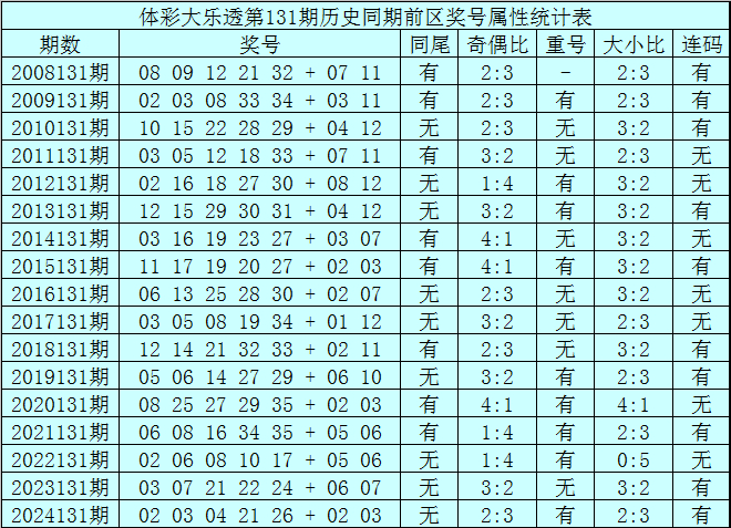 体彩大乐透第131期历史同期开出17次奖号,其统计详见下表:
